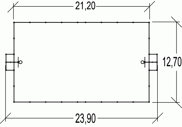 Modulets dimensioner er som følger: 23,90 m i længden, 12,70 m bred, 3,90 m høj.