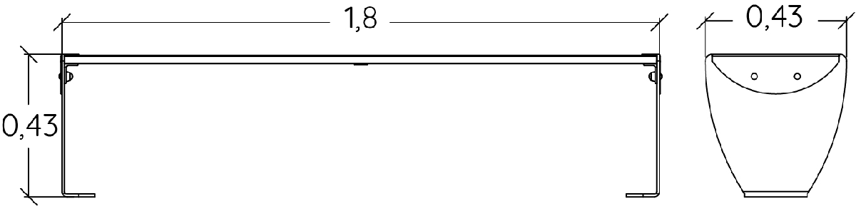 Modulets dimensioner er som følger: 1,80 m i længden, 0,43 m bred, 0,43 m høj.
