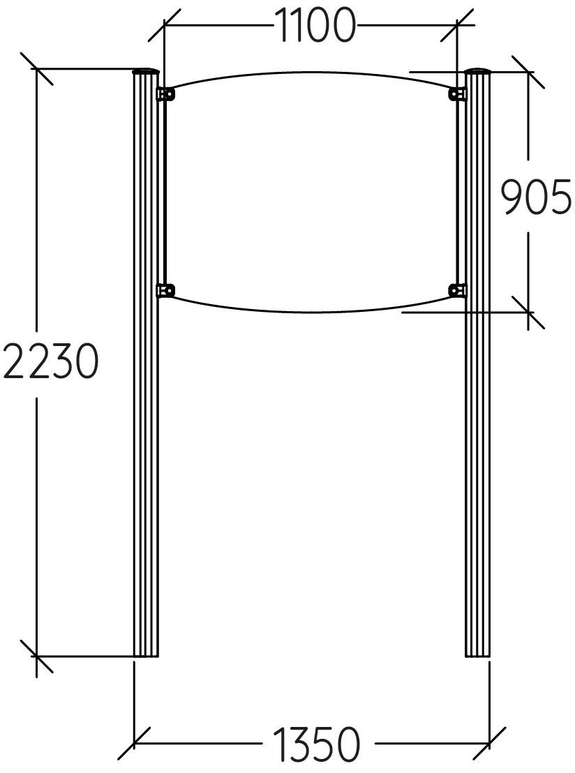Modulets dimensioner er som følger: 1,35 m i længden, 0,10 m bred, 2,23 m høj.