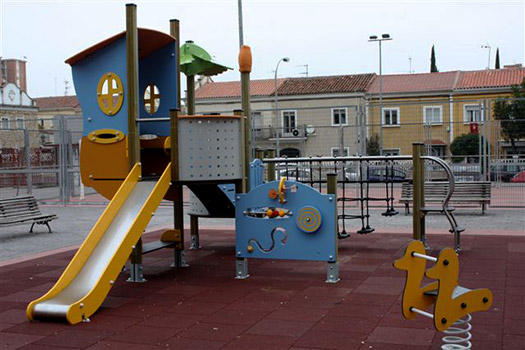 Multilegeanlæg med forhøjet legehus, rutsjebane, rebro og legepaneler - J3355