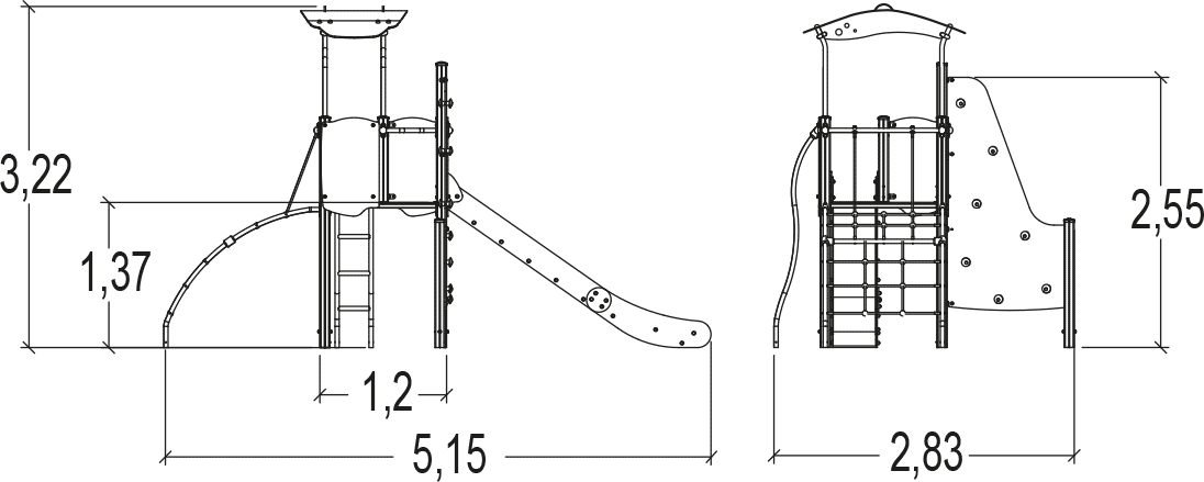 Modulets dimensioner er som følger: 2,85 m i længden, 5,14 m bred, 3,22 m høj. Den frie faldhøjde (HCL) er 2,60 m.
