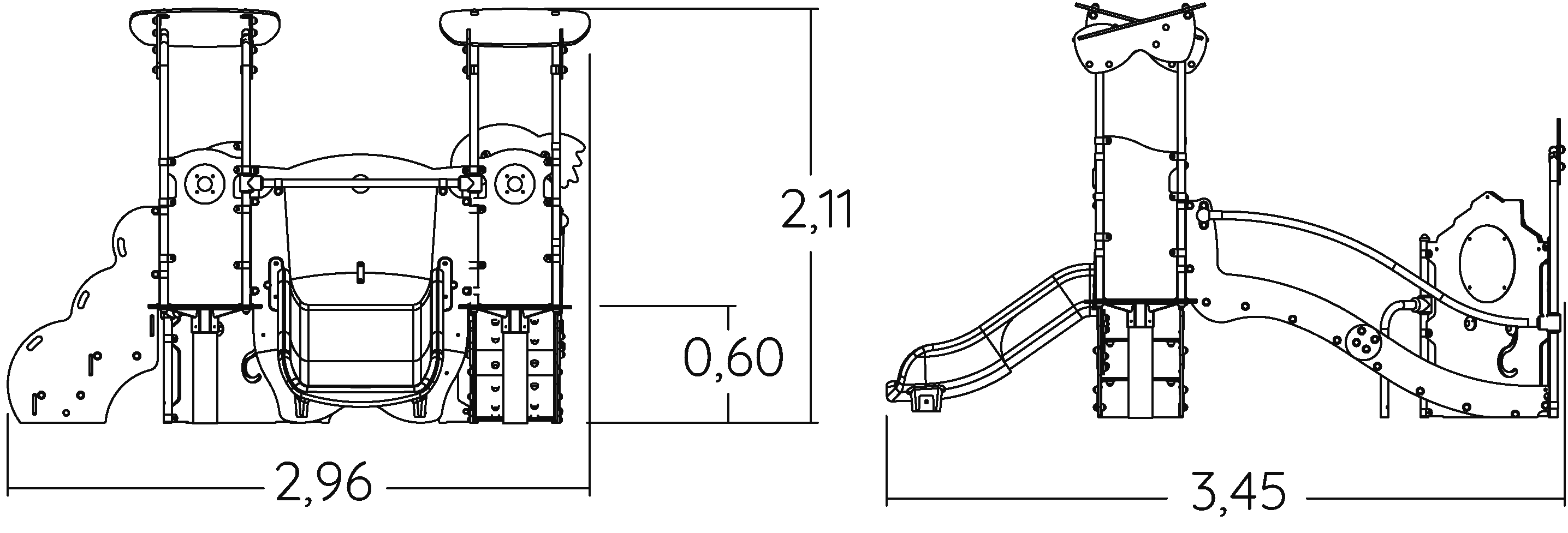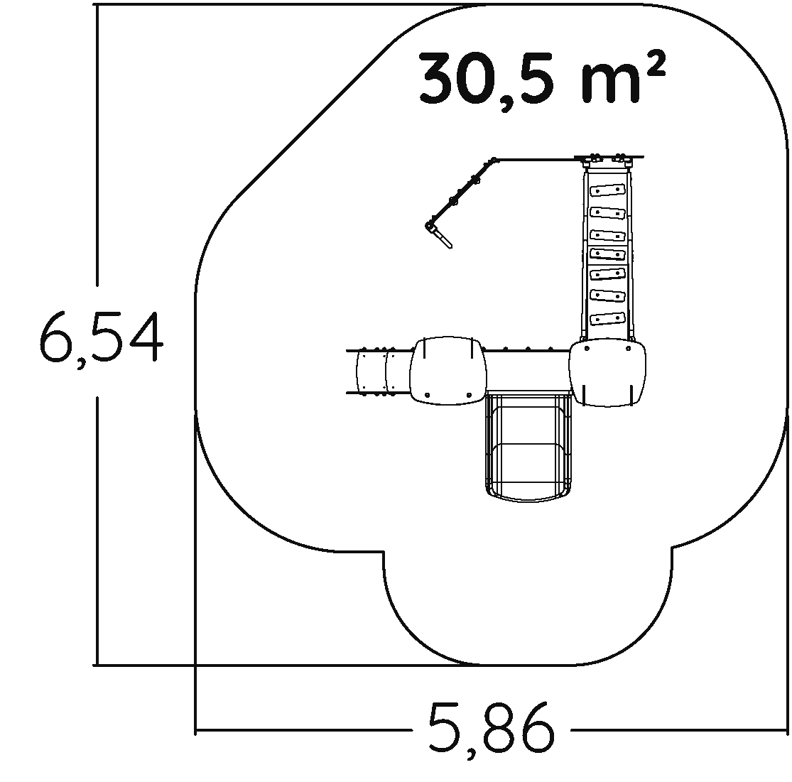 Modulets dimensioner er som følger: 3,43 m i længden, 2,93 m bred, 2,12 m høj. Den frie faldhøjde (HCL) er 1,00 m.