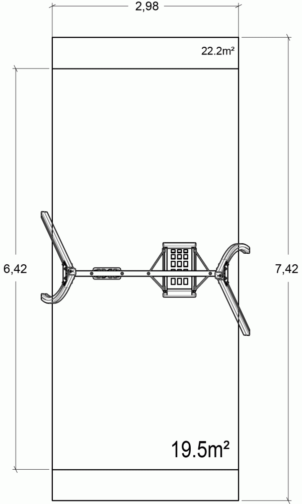 Modulets dimensioner er som følger: 3,34 m i længden, 1,98 m bred, 2,60 m høj. Den frie faldhøjde (HCL) er 1,37 m.