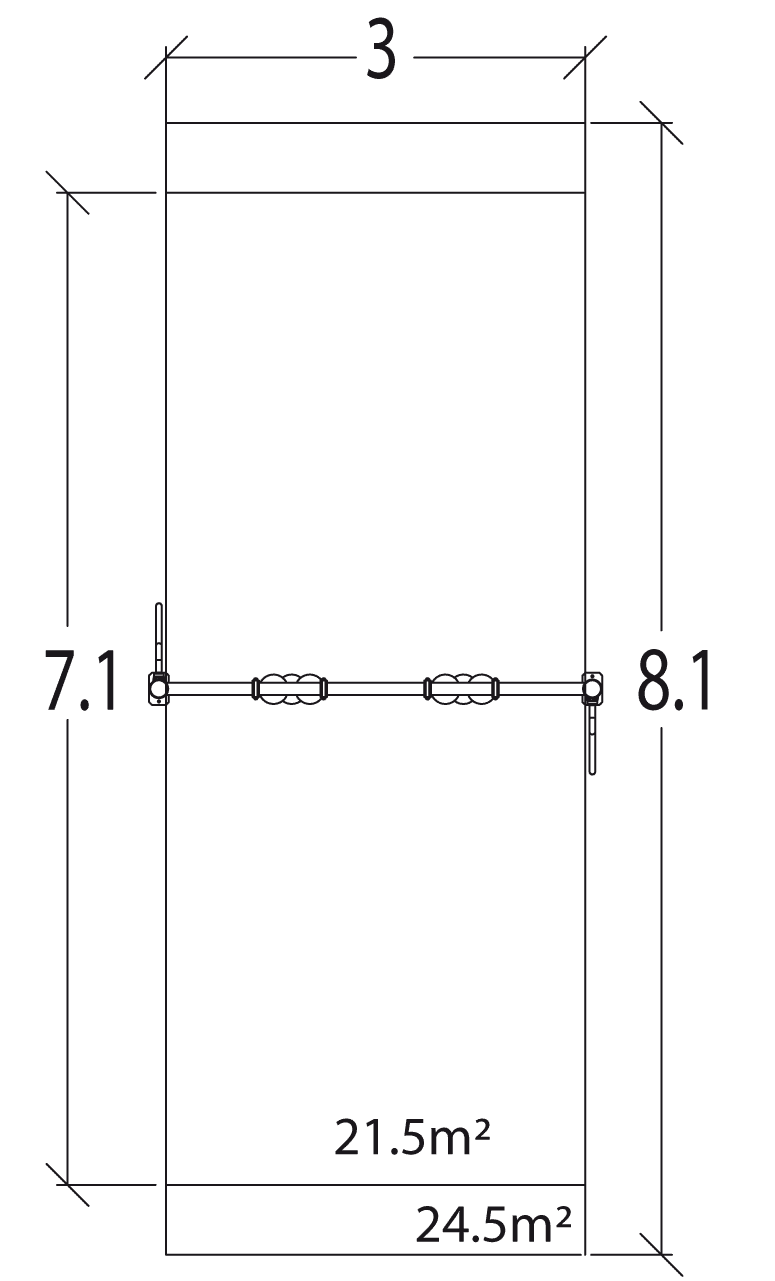 Modulets dimensioner er som følger: 3,23 m i længden, 0,21 m bred, 2,55 m høj. Den frie faldhøjde (HCL) er 1,40 m.