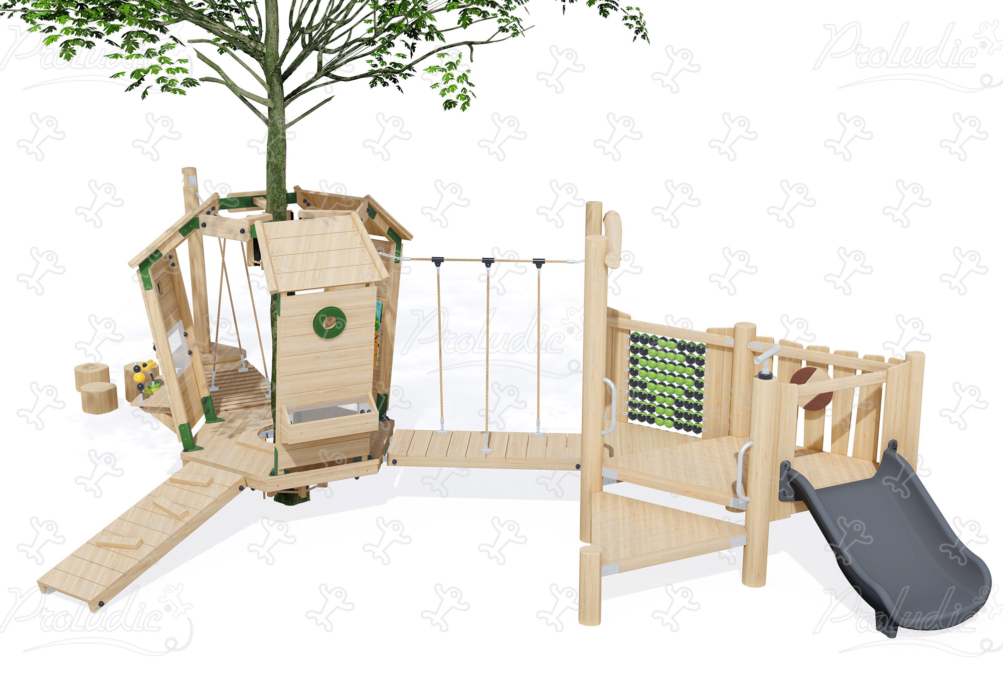 Platform forbundet med træerne med træhytte og legepanel - J49903®