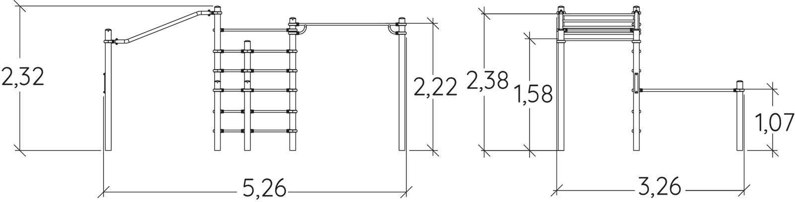 Modulets dimensioner er som følger: 5,26 m i længden, 3,26 m bred, 2,32 m høj. Den frie faldhøjde (HCL) er 1,70 m.