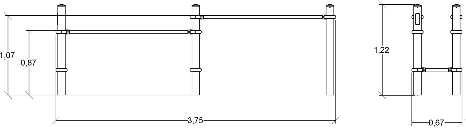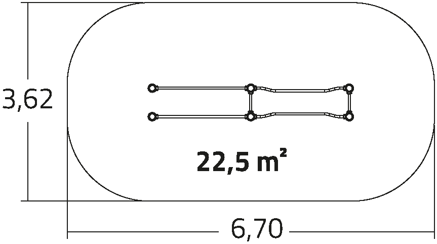 Modulets dimensioner er som følger: 3,75 m i længden, 0,67 m bred, 1,22 m høj. Den frie faldhøjde (HCL) er 1,10 m.