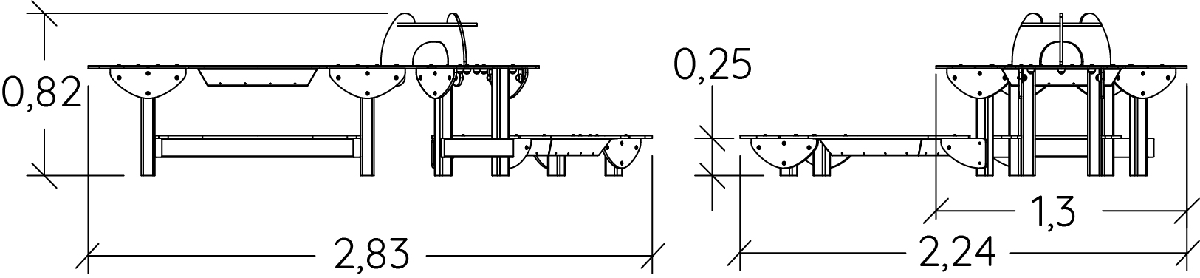 Modulets dimensioner er som følger: 2,83 m i længden, 2,24 m bred, 0,82 m høj.