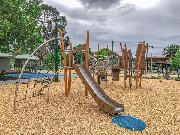 Multilegeanlæg med rutsjebaner, klatreaktiviteter og nettunnel i trælook-farve - J5611-C®